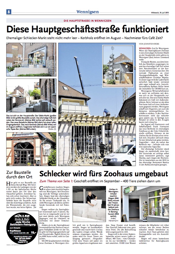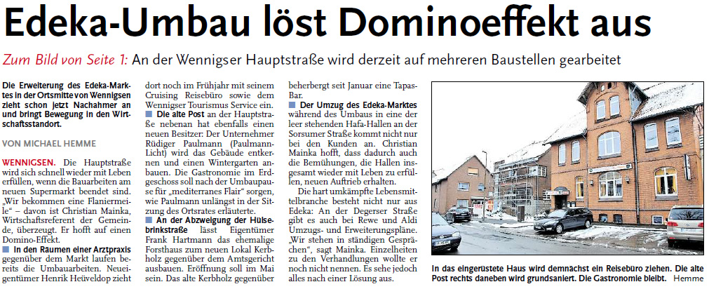 Die Vorarbeiten der letzten sechs Jahre werden langsam sichtbar. Die Stärkung des Zentzrums durch die Erweiterung des EDEKAs kommt insb. den kleineren Händlern zugute. Von 55 Händlern und Dienstleistern sind 54 in Wennigsens Hauptstraße inhabergeführt. Das ist einmalig! Wir haben bis auf eine normale Fluktuation keine Leerstände! Die Strategie des Knochenprinzips mit jeweils zwei starken Frequenzbringern an den Enden geht auf.