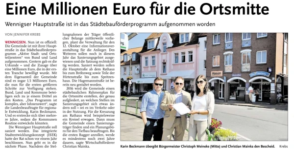 Das Wennigser Zentrums ist offiziell in das Städtebauförderungsprogramm von Bund und Land mit einem Projektvolumen von ca. 5,4 Mio. Euro aufgenommen worden. Davon entfallen ca. 3,9 Mio. Euro auf reine Zuschüsse, der Rest ist kommunaler Eigenanteil und Anliegerausgleichsbeiträge. Vorausgegangen war ein zweijähriger Prozess in dem wir unter viel Bürgerbeteiligung ein integriertes Stadtentwicklungskonzept entwickelt und ein Sanierungsgebiet mit eigener Satzung beschlossen haben. Neben der Zusage über die Programmaufnahme gab es sogleich die erste Fördermillion als Zuwendungsbescheid von der Landesbeauftragten Beckmann.
